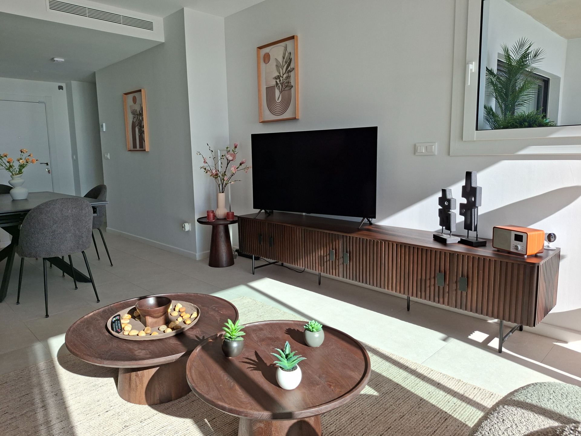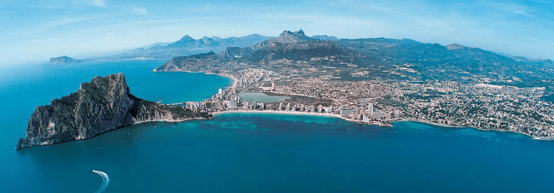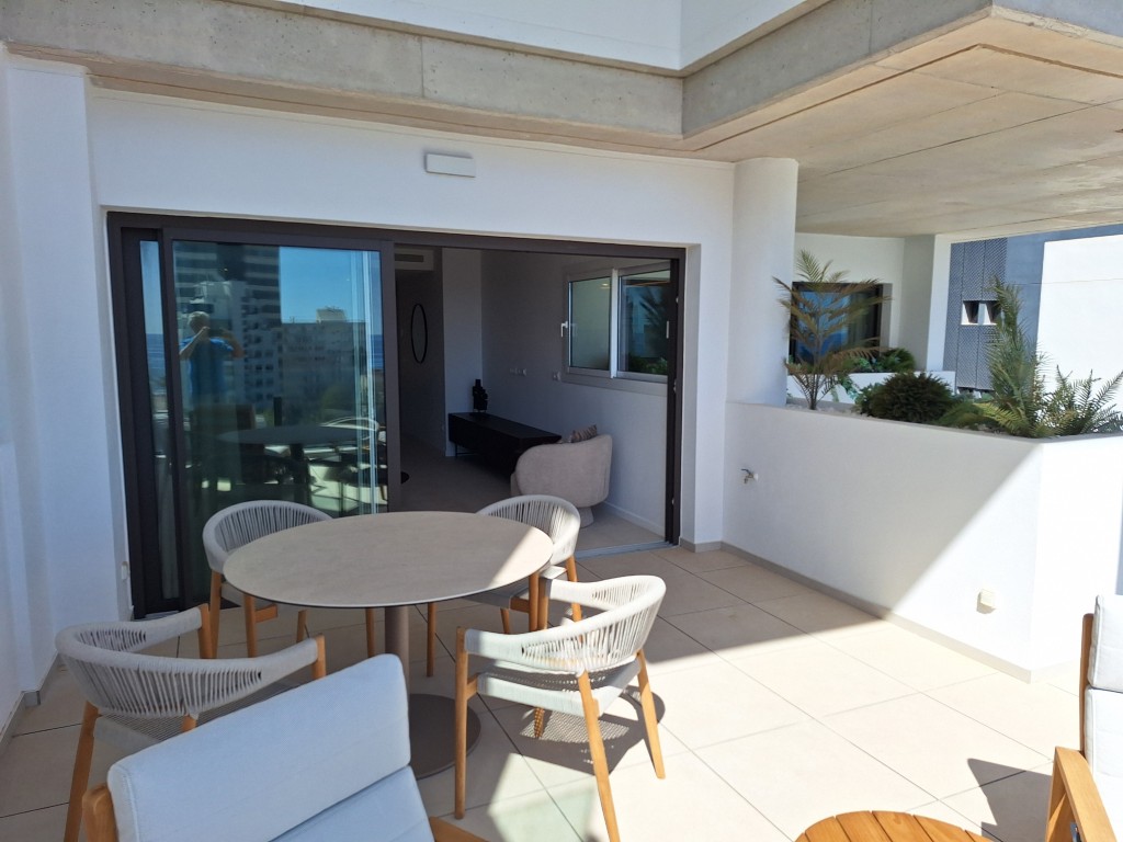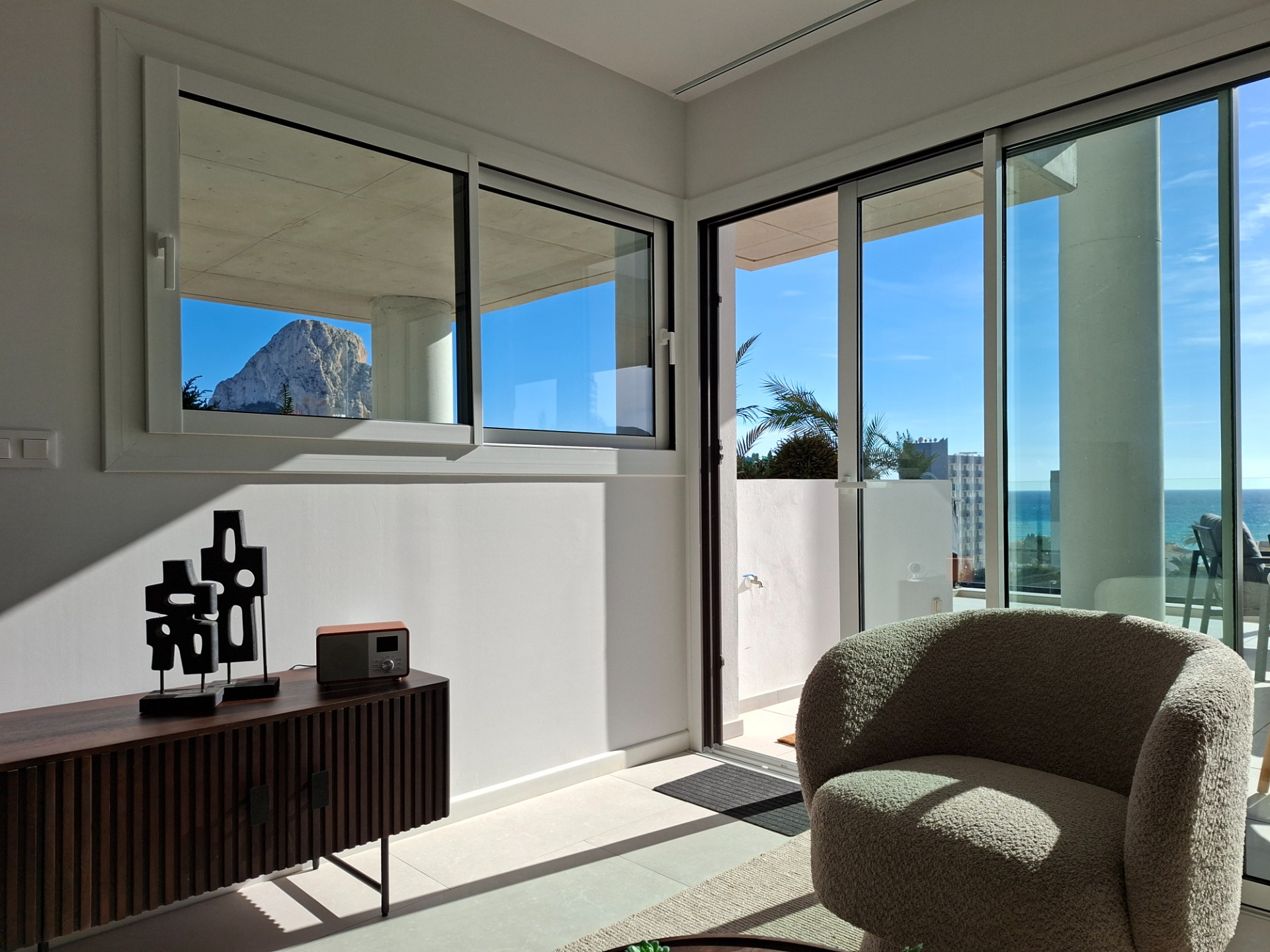 Het zeer ruime terras van 32m² is zuidgericht met adembenemend panoramisch zicht op de zee, vissershaven en, vlak bij, de 332m hoge Peñon de Ifach, symbool voor Costa Blanca.